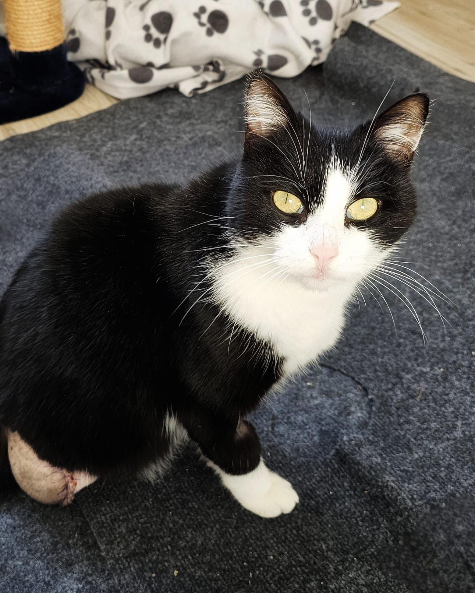 Jetzt lernt er, mit drei Beinen zurecht zu kommen und macht das auch schon richtig gut.